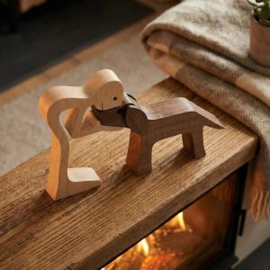 Hand Carved Wooden Man and Dog Figurine – Minimalist Natural Wood Sculpture for Home Decor