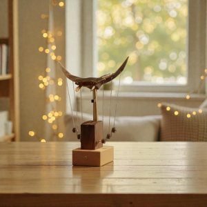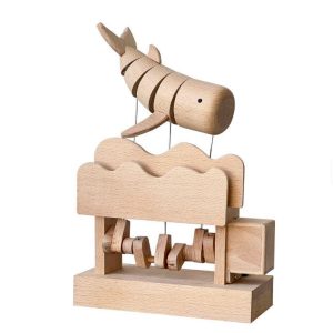 Hand-carved wooden automata and kinetic sculptures designed for desk, shelf, and office display.