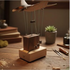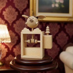 Wooden Flying Pig Automaton – Handcrafted Mechanical Kinetic Desk Sculpture Natural Wood