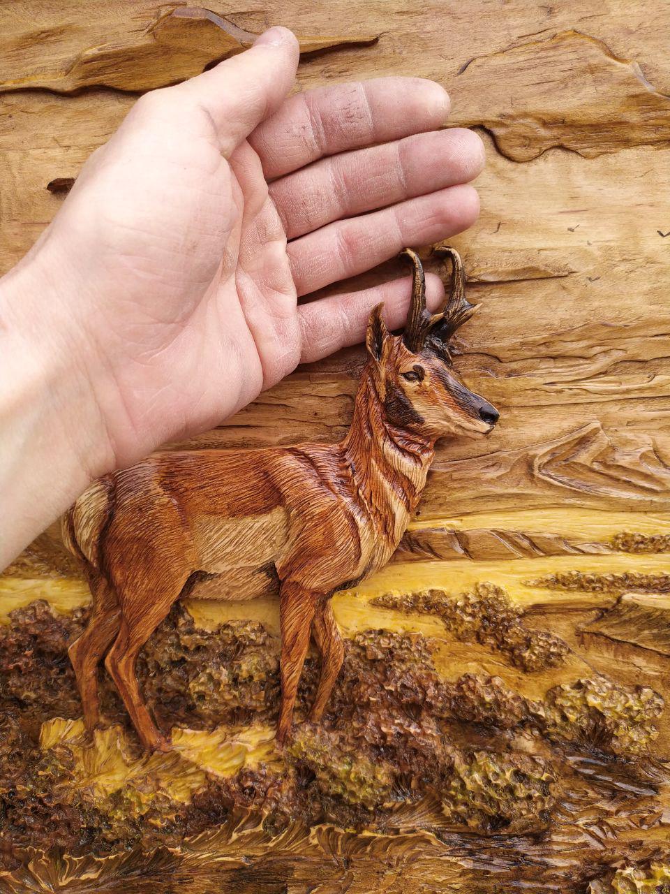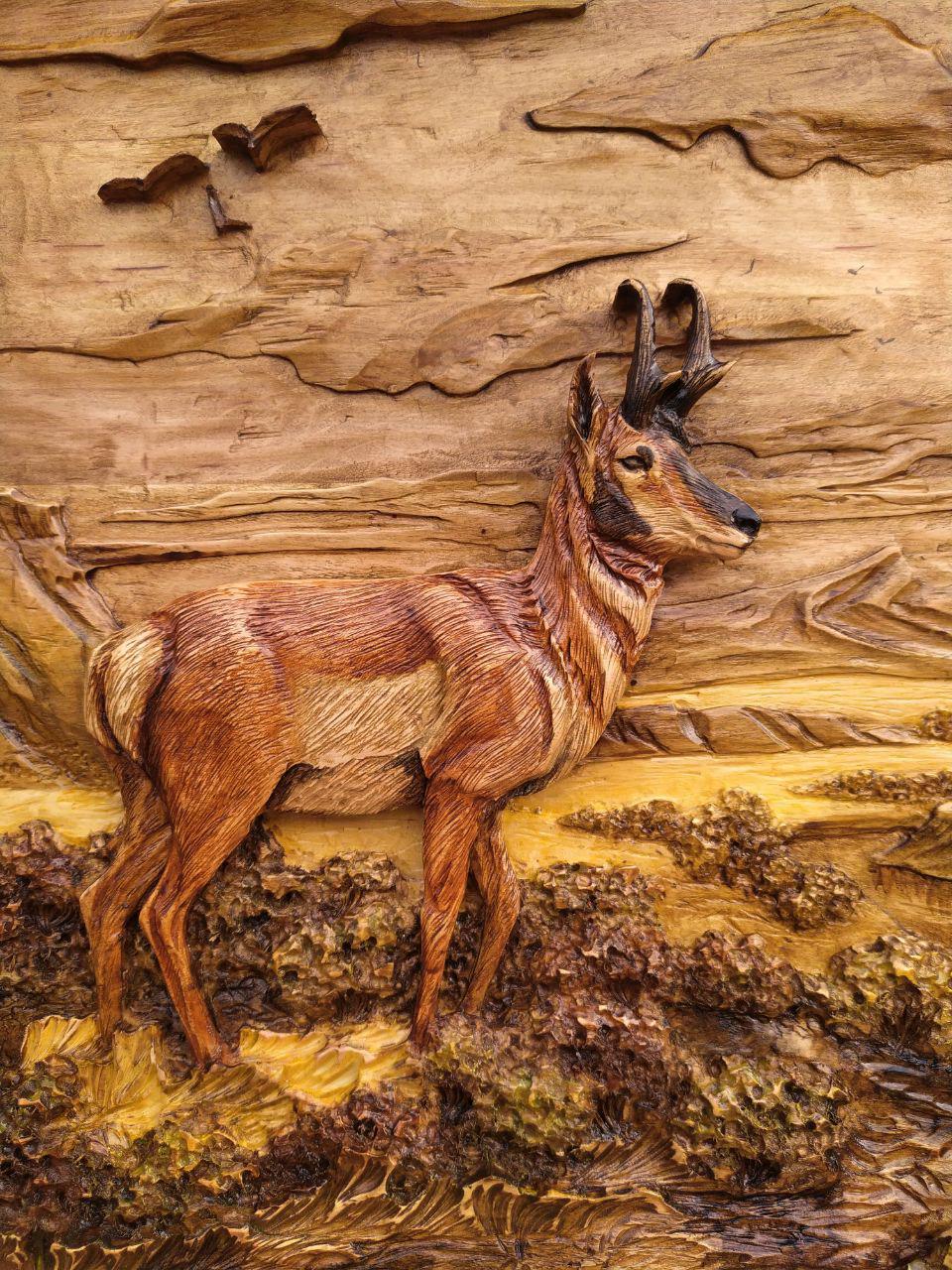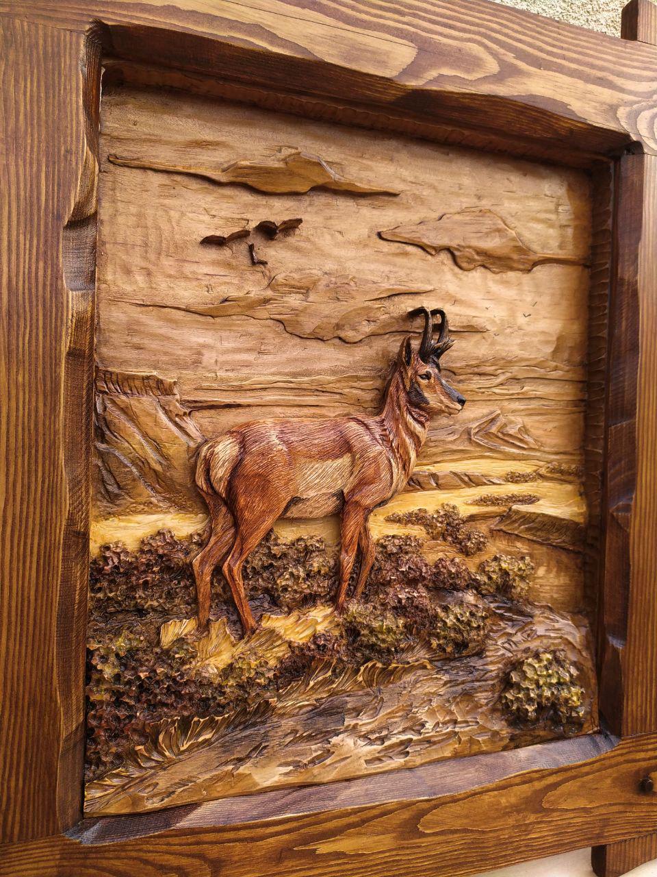 3D Hand-Carved Wooden Wall Art – Pronghorn Antelope Wildlife Habitat Wood Carving