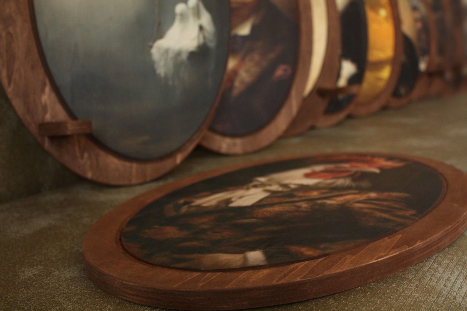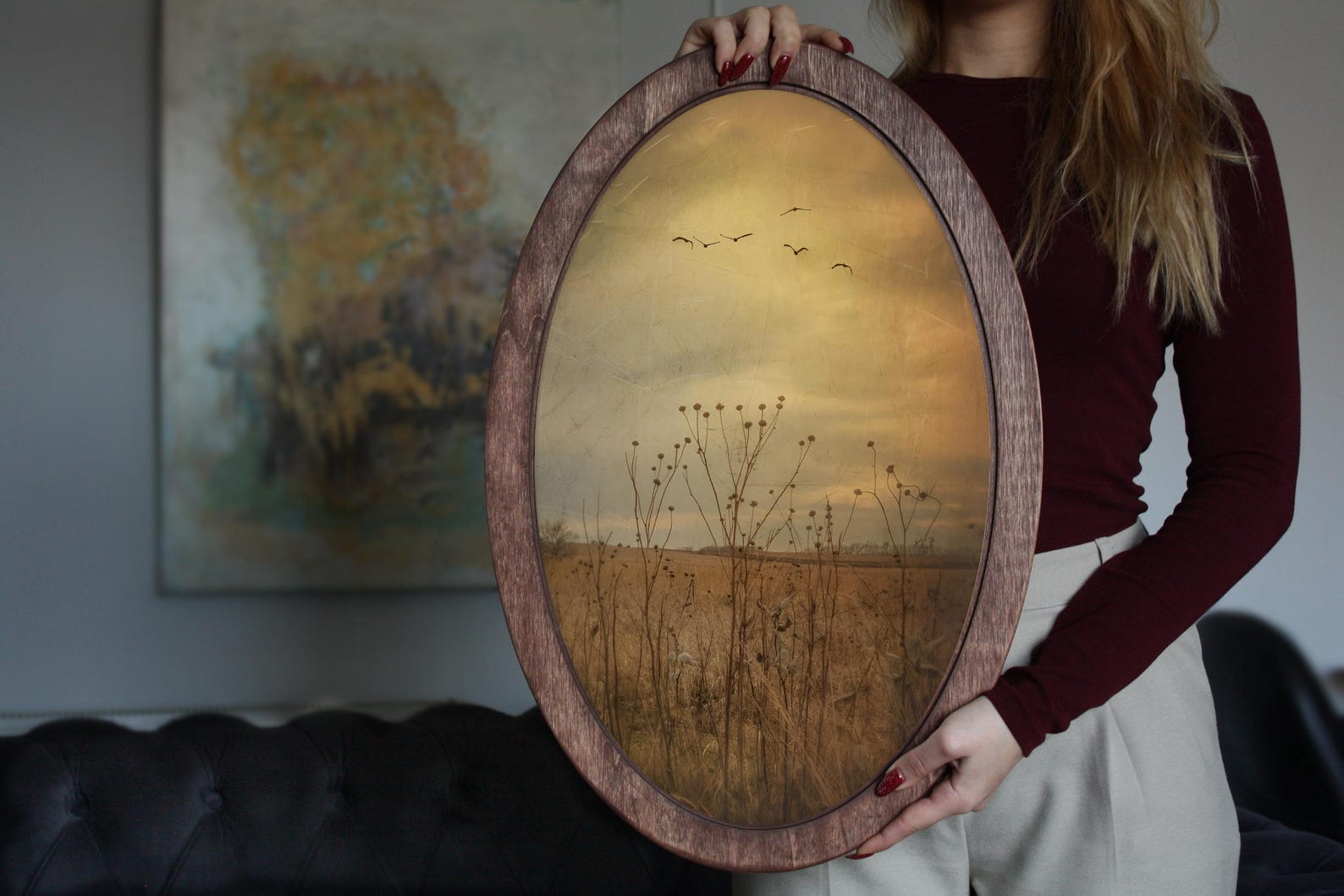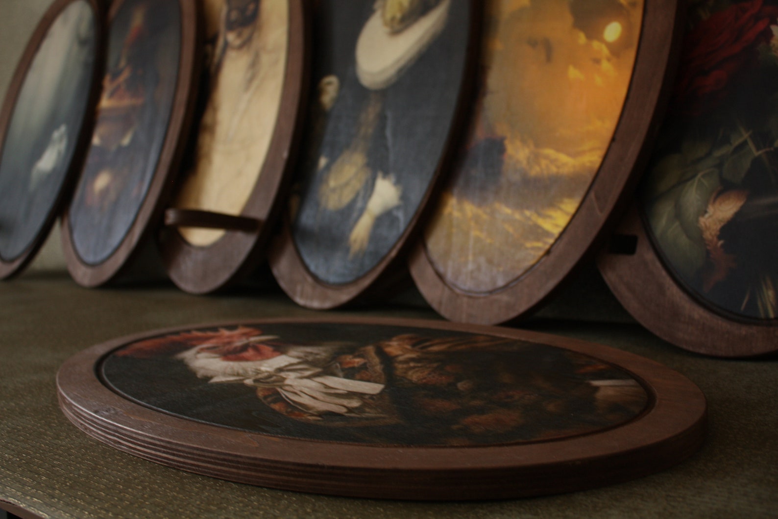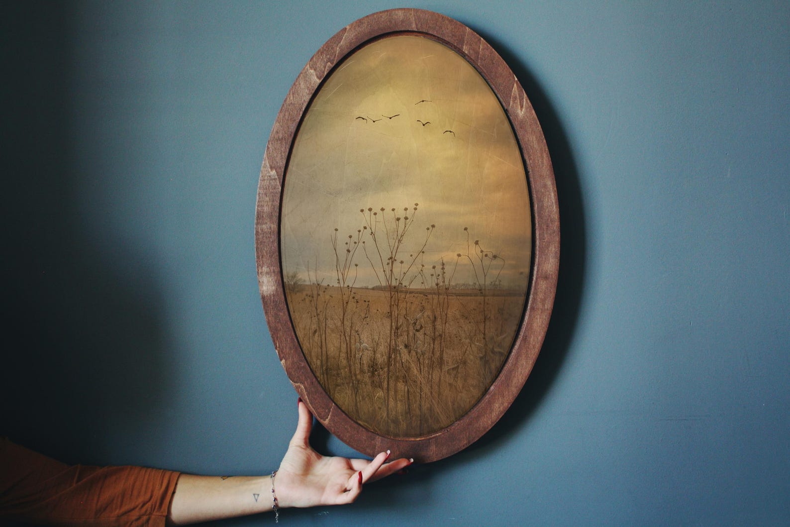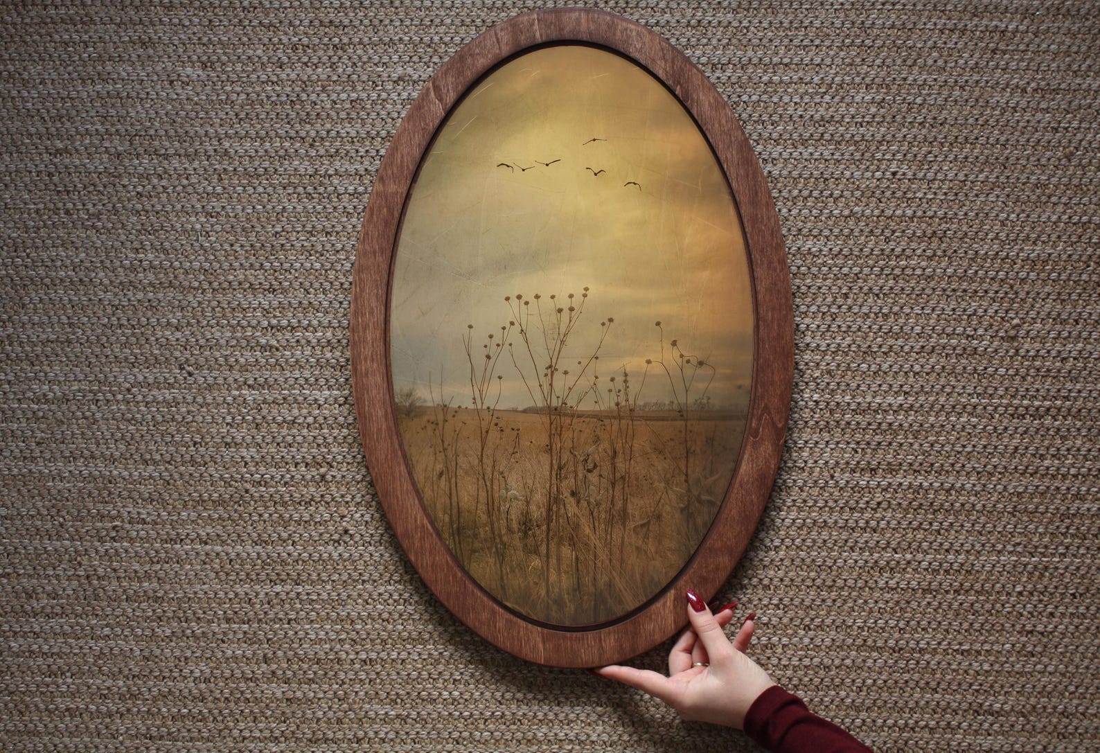 Oval wooden wall plaque featuring a hand-applied field pattern in an antique style. Made from natural solid wood — not a paper or digital print. The pattern is applied directly to the wood surface. Smooth finished edges. Ready to hang. Natural variation in wood grain and pattern finish between pieces is expected.