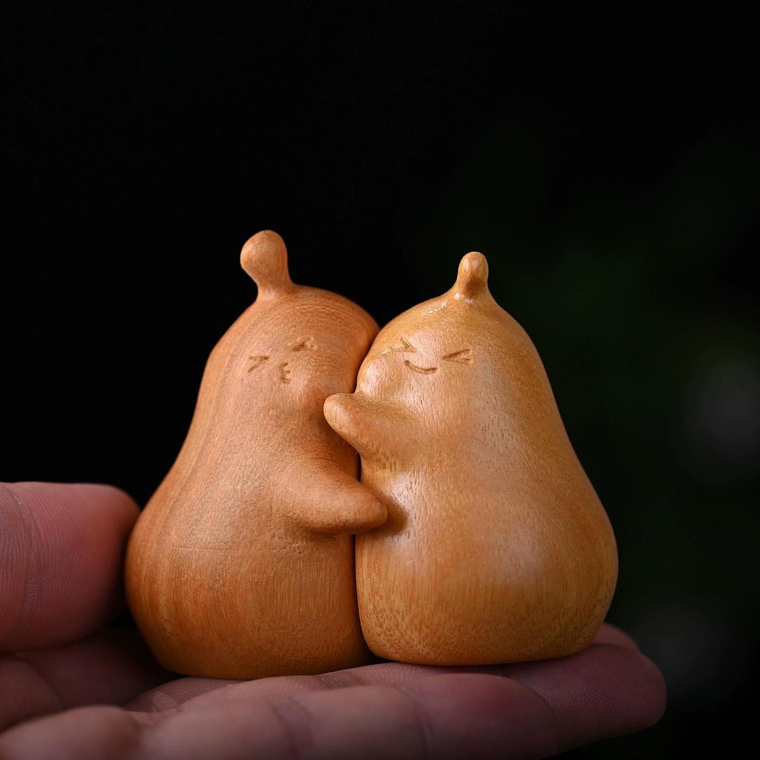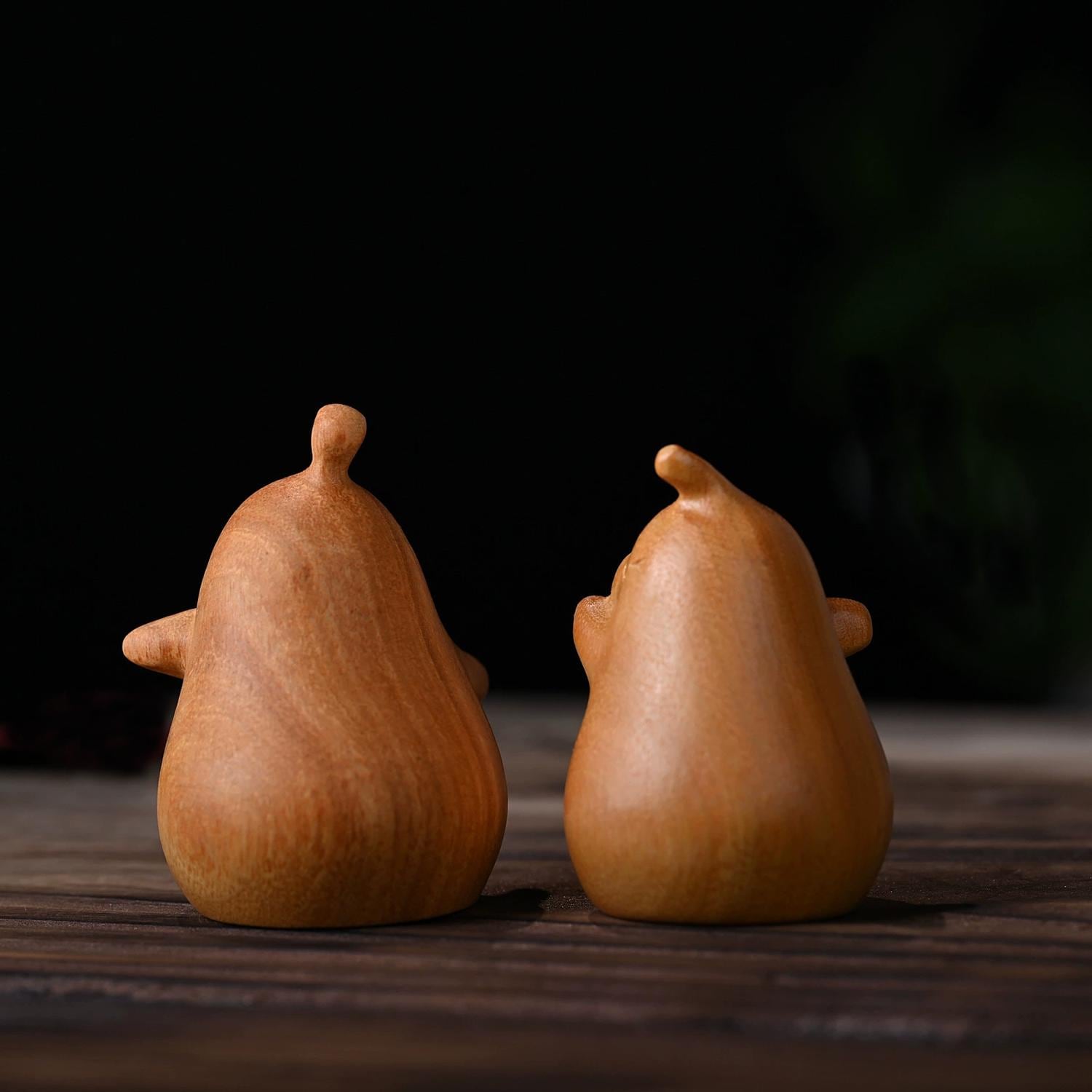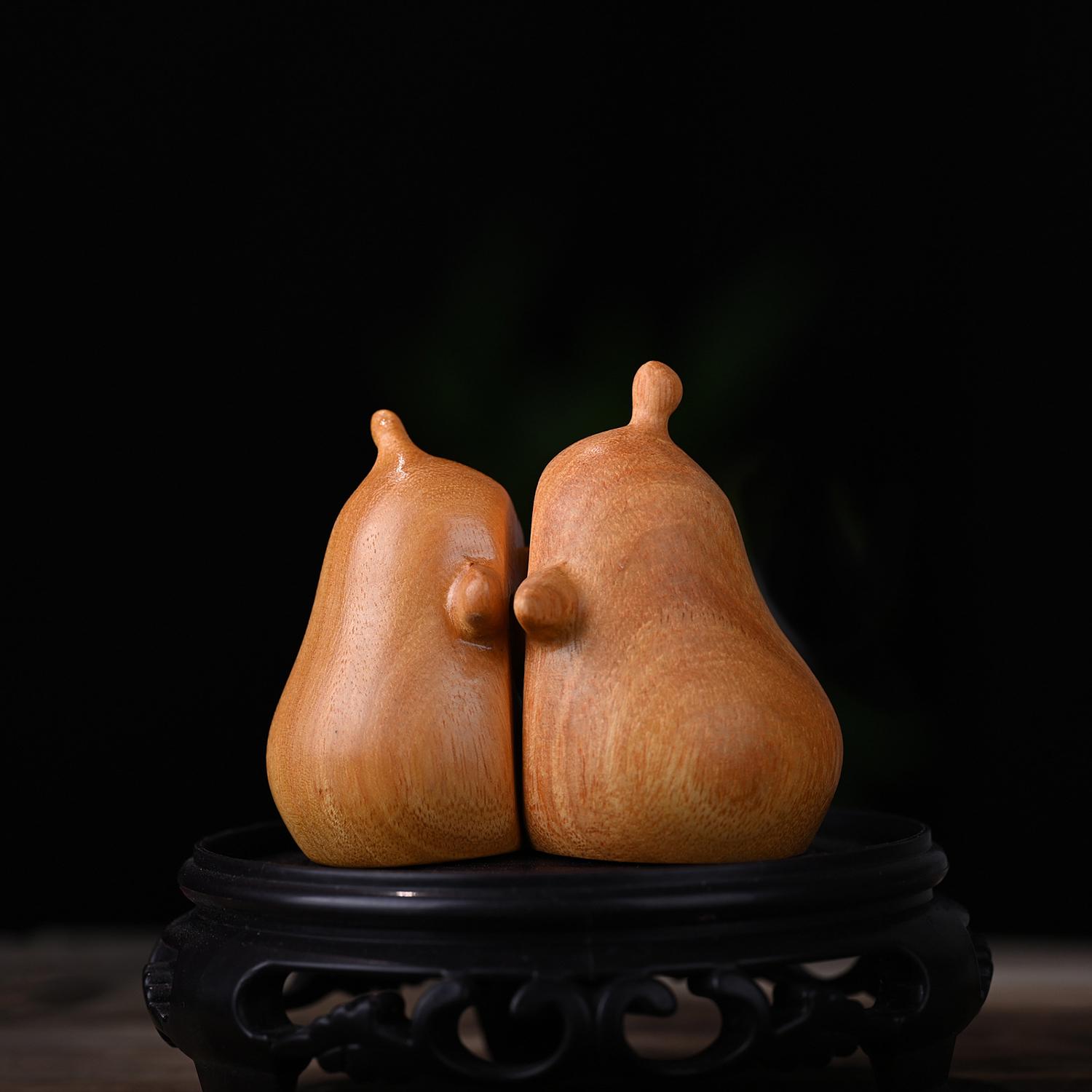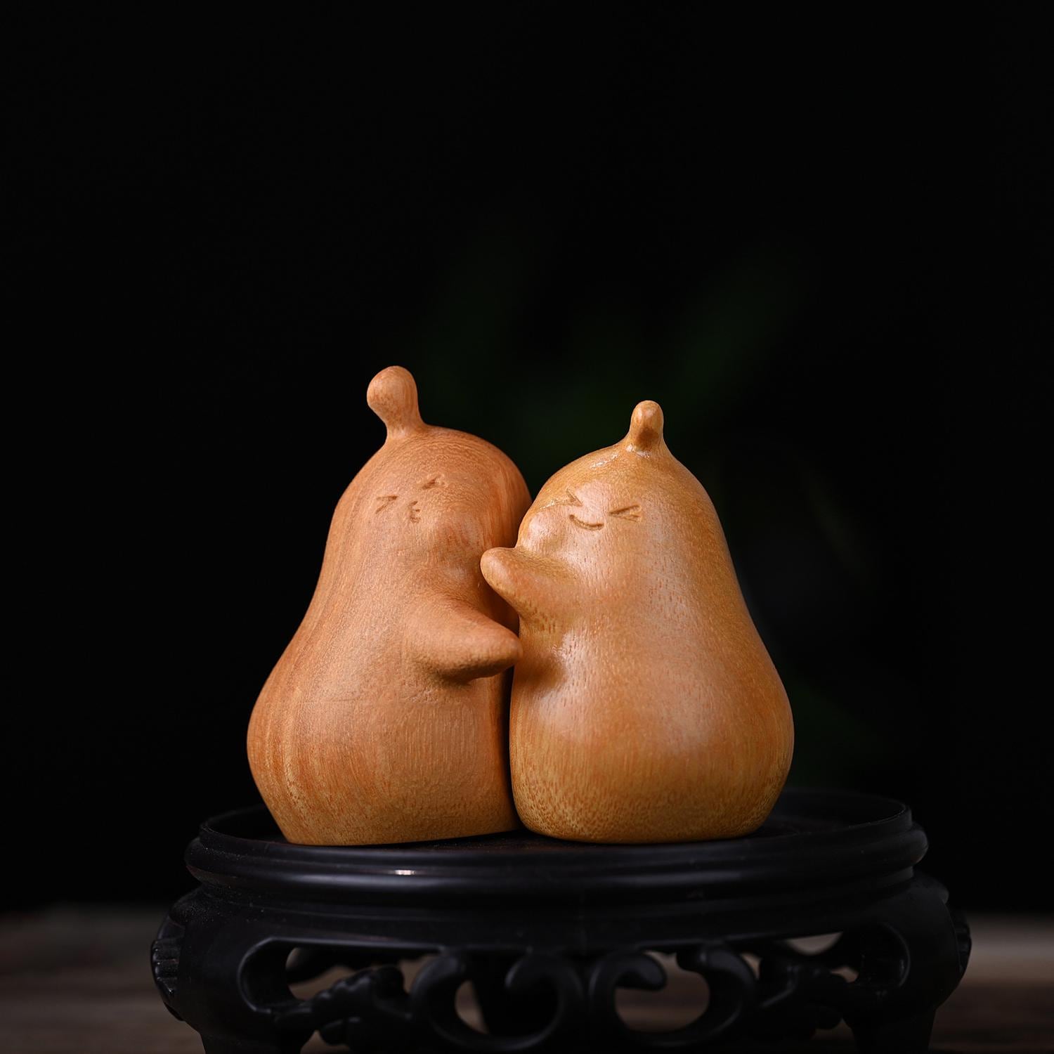 Hand-carved wooden couple figurines crafted from golden rosewood. Each pair is individually shaped and finished by hand. Smooth polished surface with natural rosewood grain visible. Suitable for home display, shelf decoration, and as a keepsake. Natural variation in wood grain and tone between pairs is expected and reflects the handmade nature of the product.