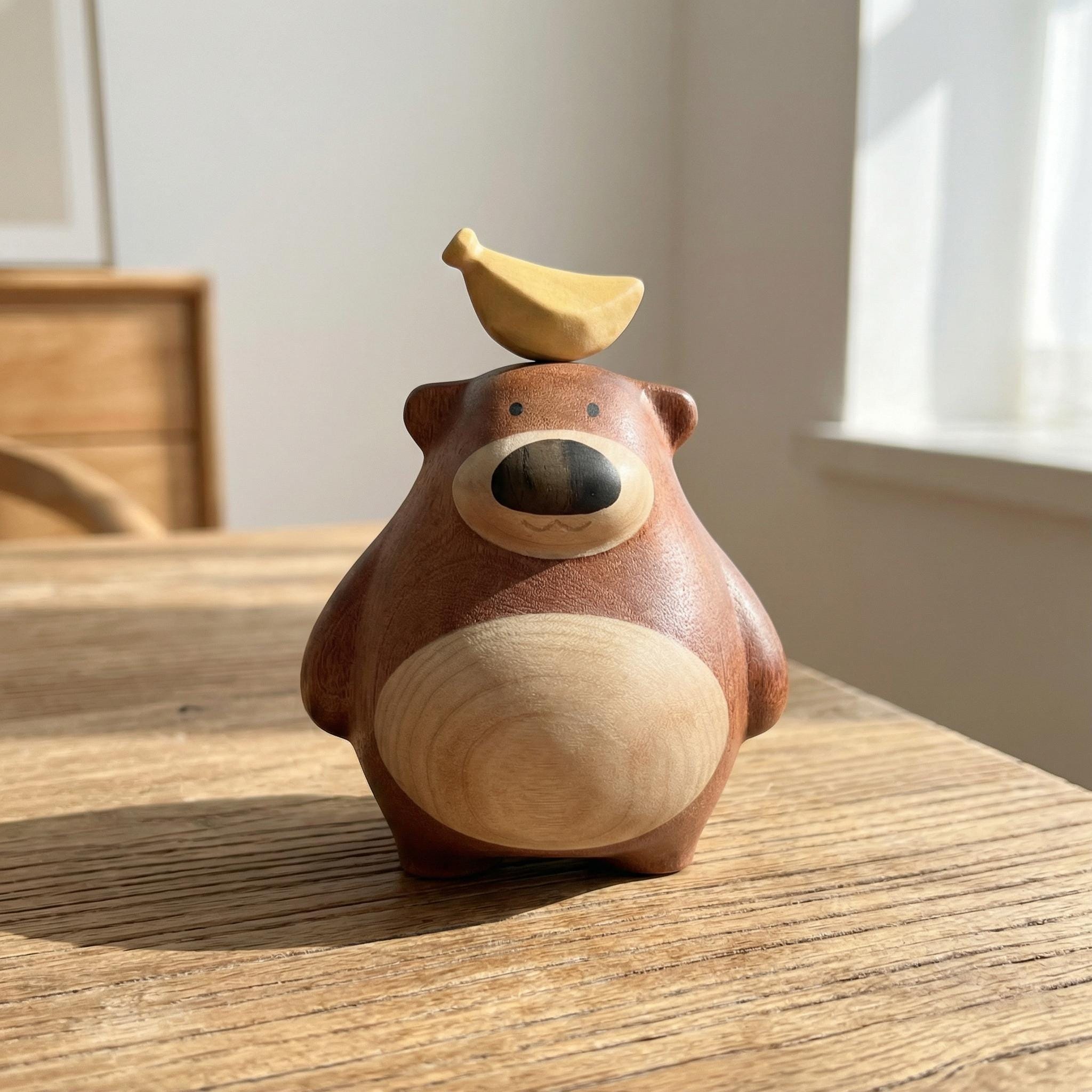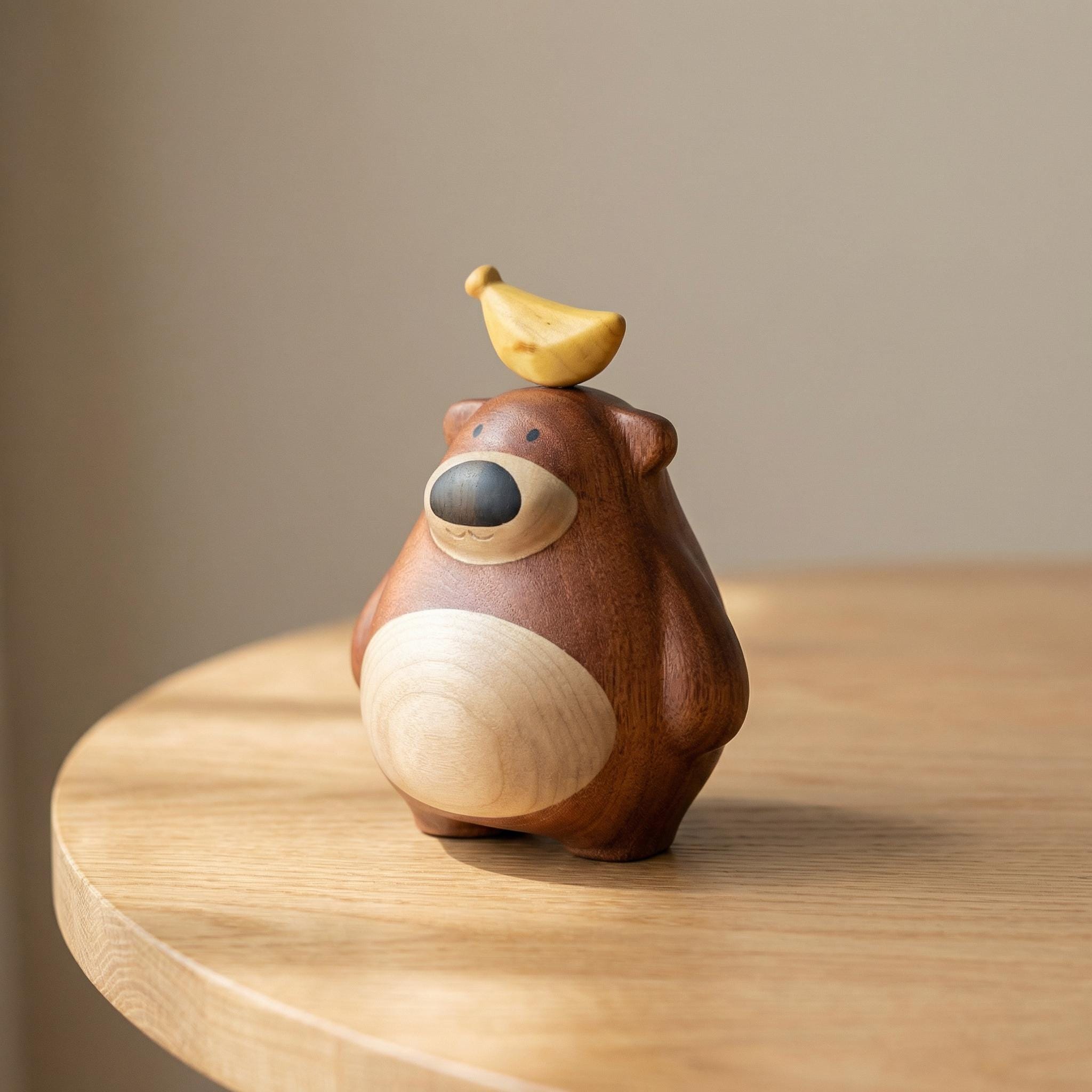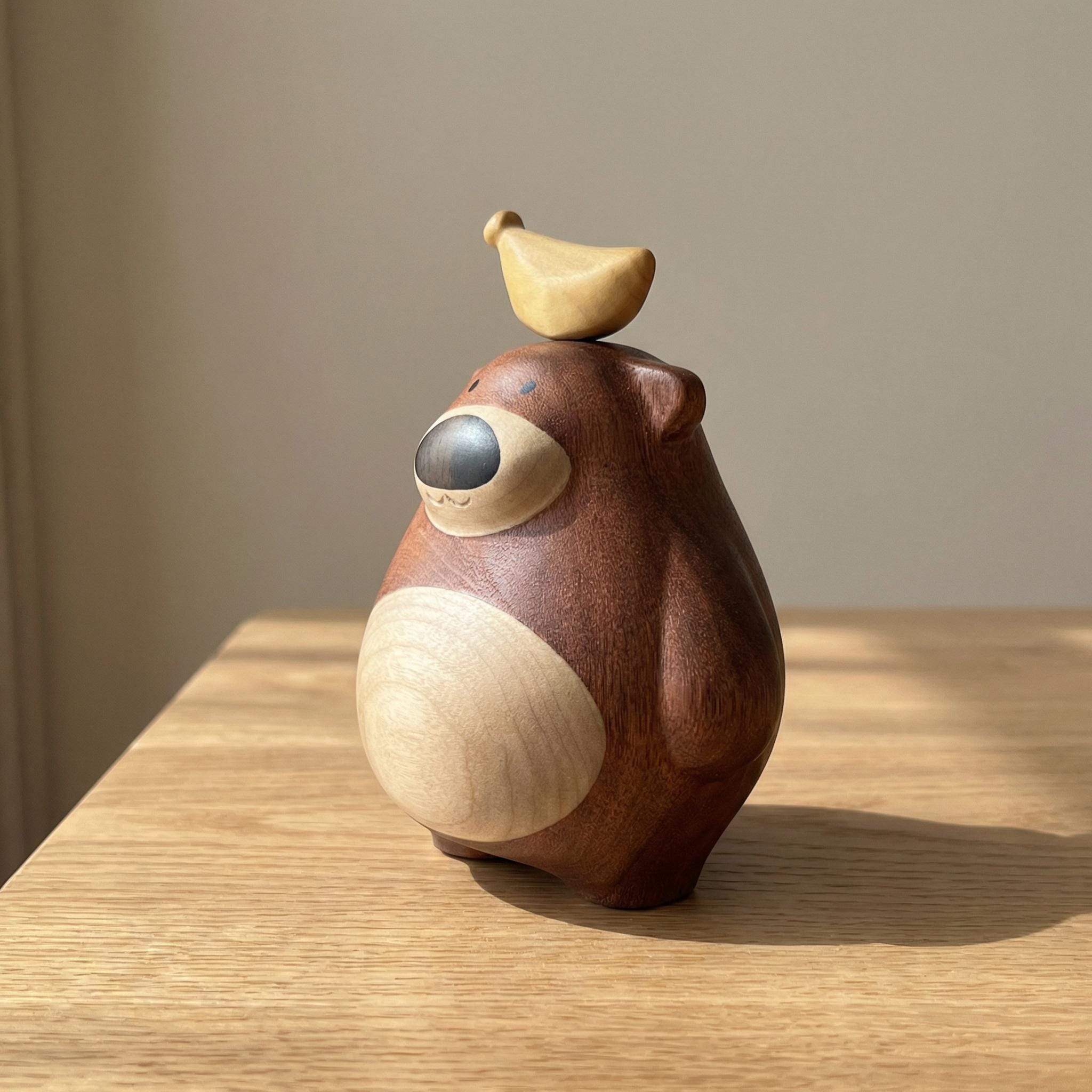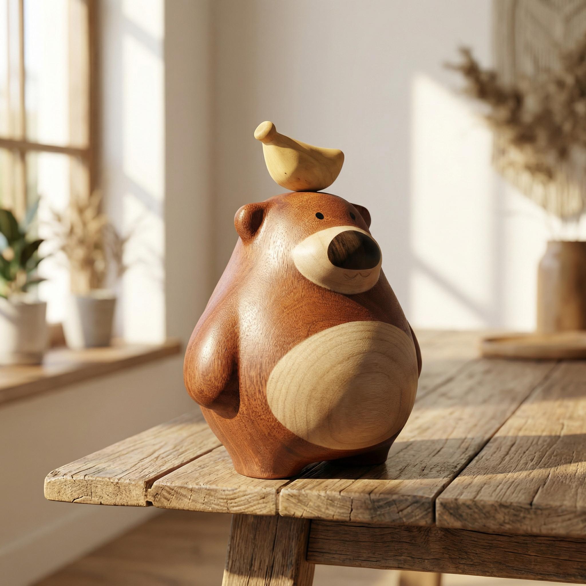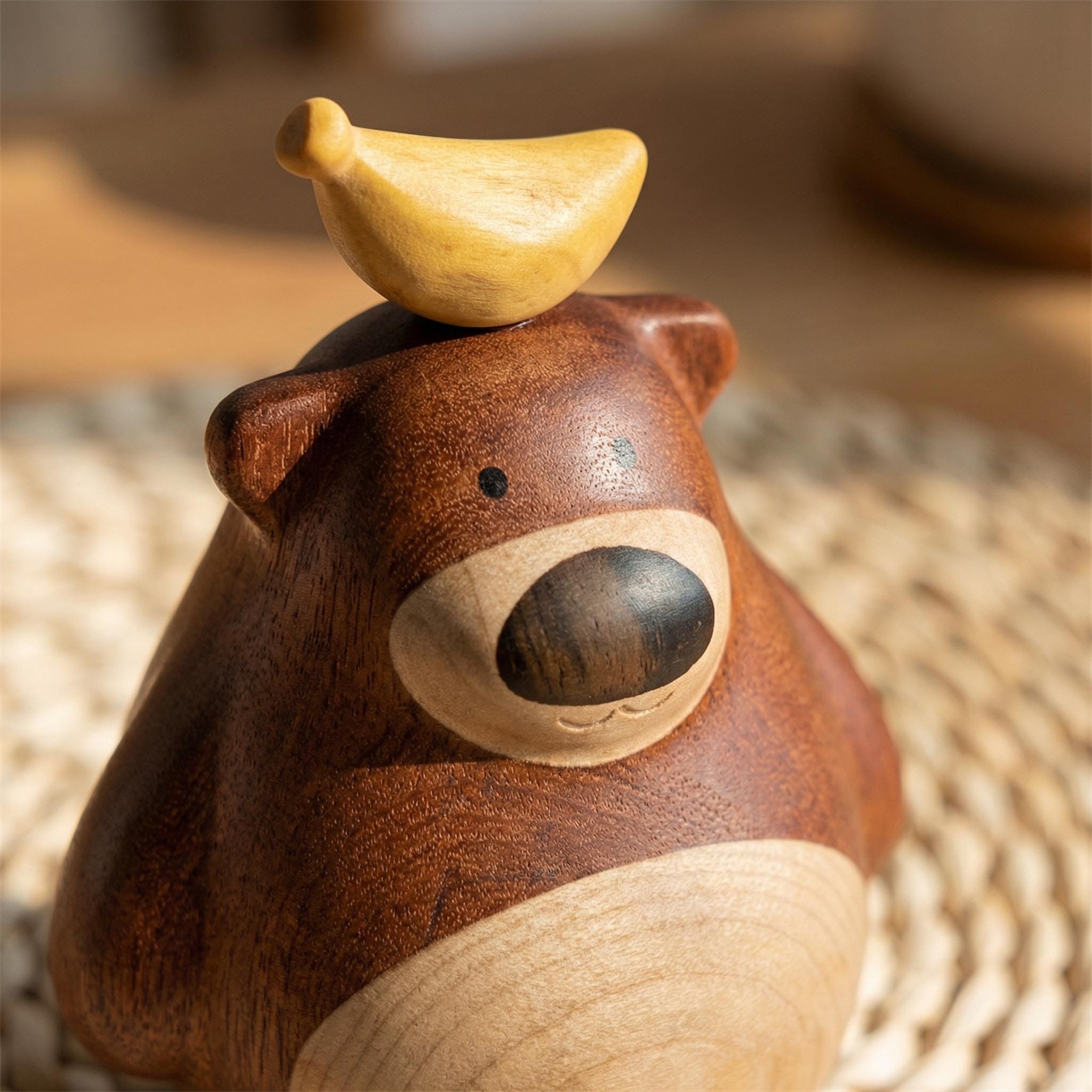Handmade wooden bear figurine crafted from natural wood. Smooth hand-finished surface with visible wood grain. Suitable for desk decoration, shelf display, and home decor. Each figurine is individually shaped and finished by hand — natural variation in wood grain and tone between pieces is expected.