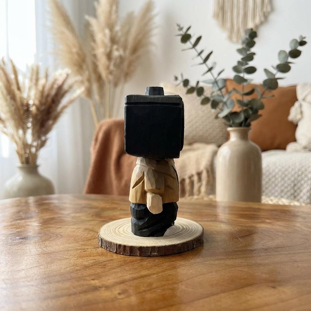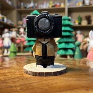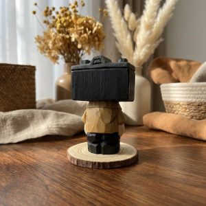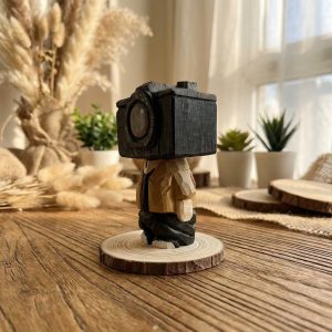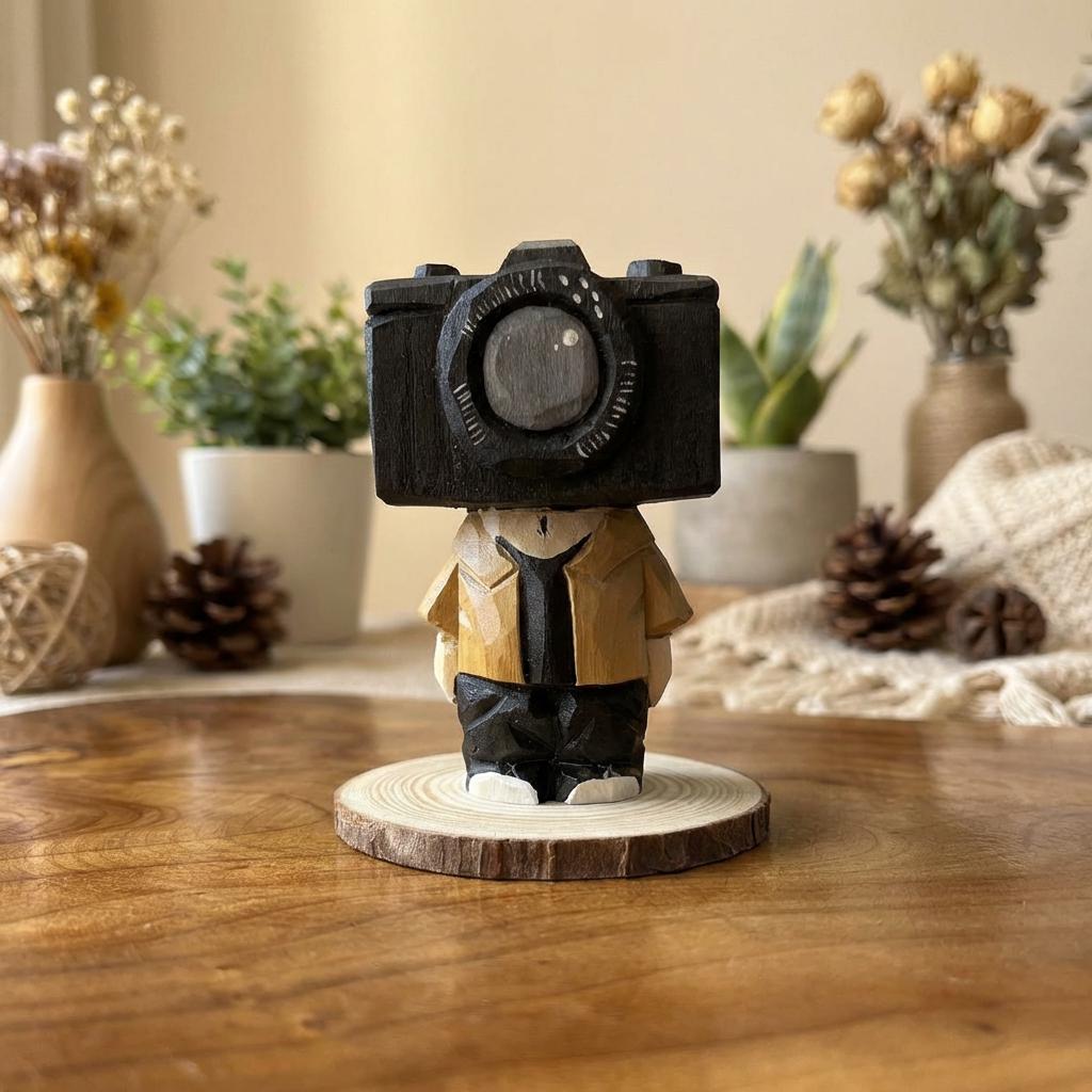 Unique handcrafted wooden figurine featuring a character with a vintage camera-shaped head. Made from natural wood with hand-carved and hand-finished details. Suitable for desk decoration and as a distinctive decorative piece for photography enthusiasts. Each figurine is individually crafted — minor variations in carving detail and finish are expected.