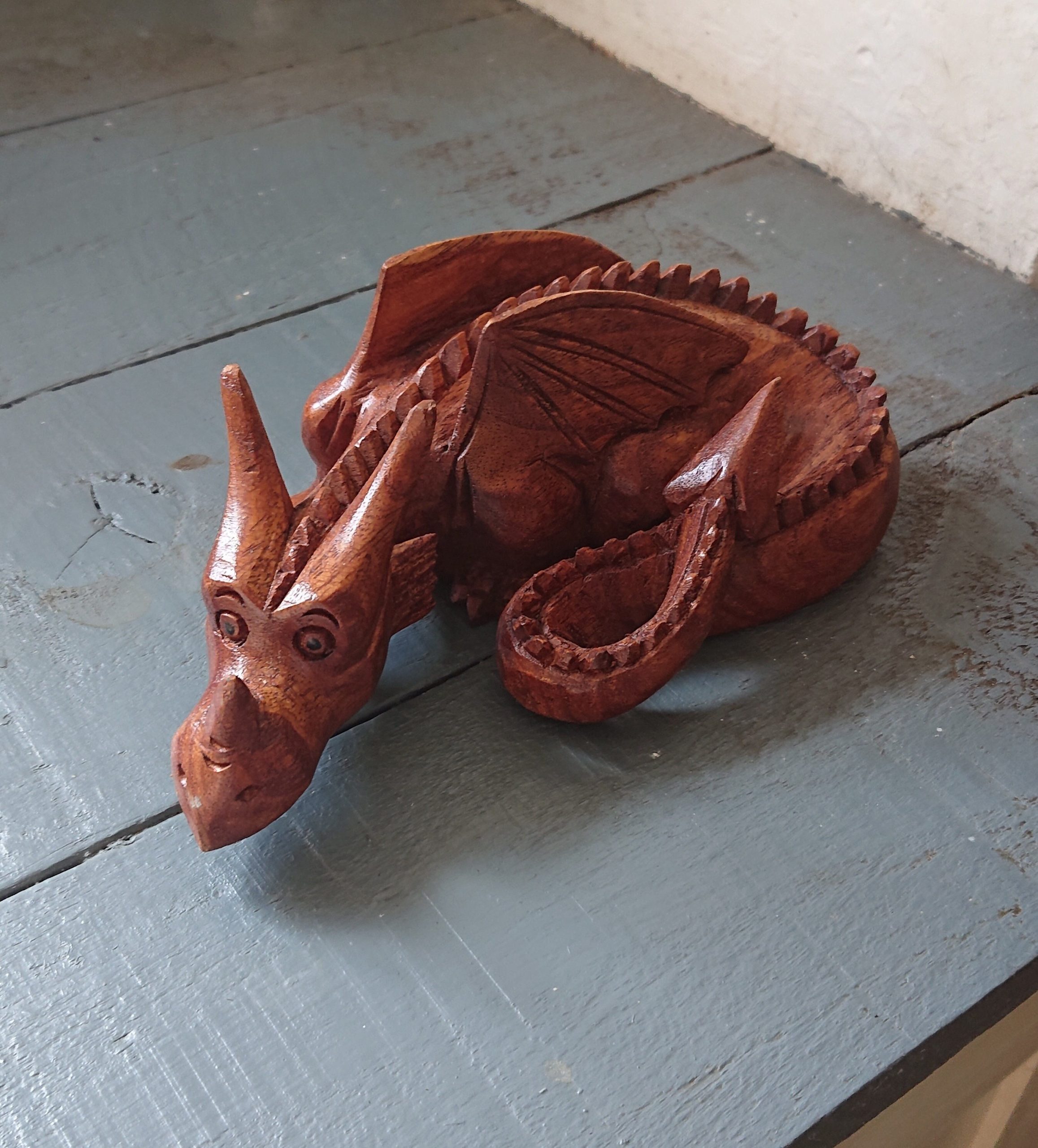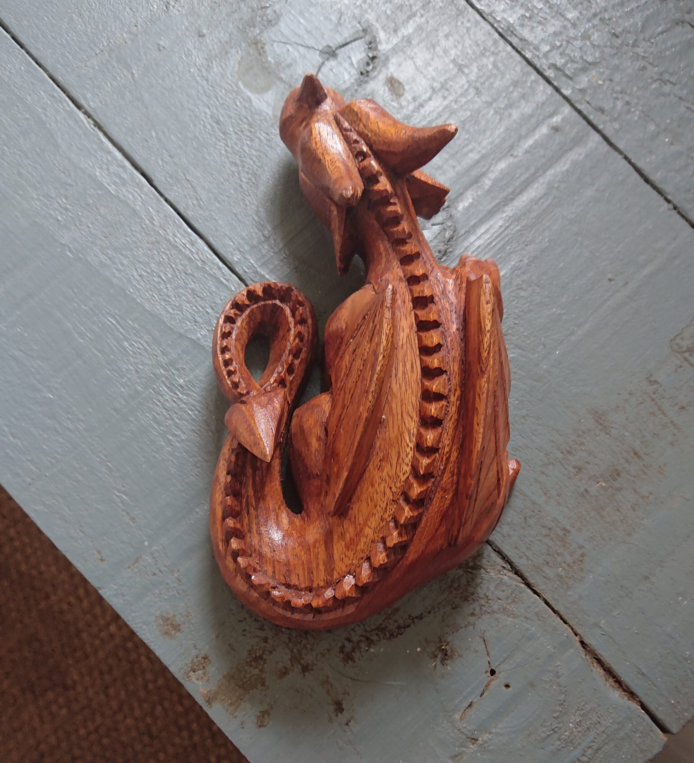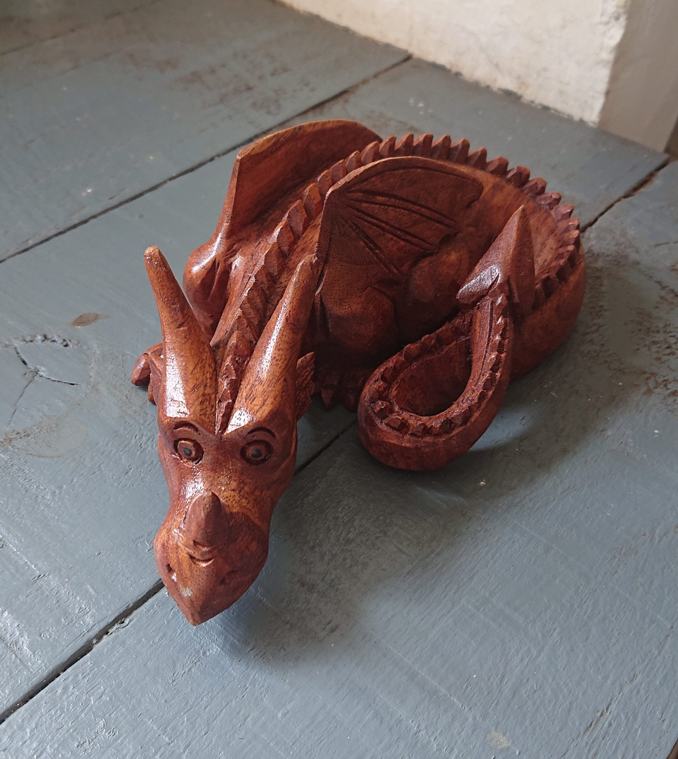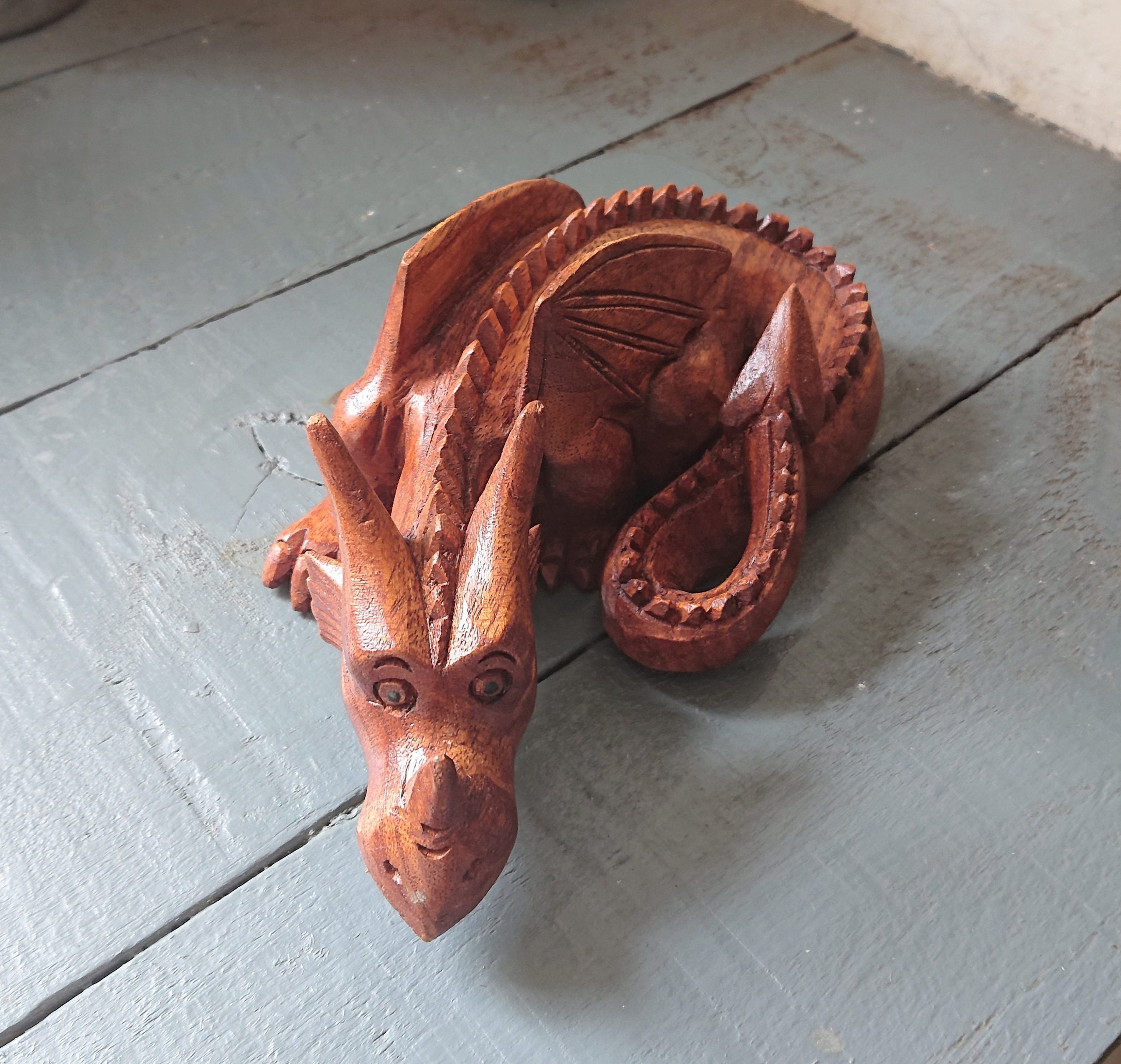 Large Hand-Carved Wooden Dragon Sculpture – Beeswax Finished Natural Wood Figurine